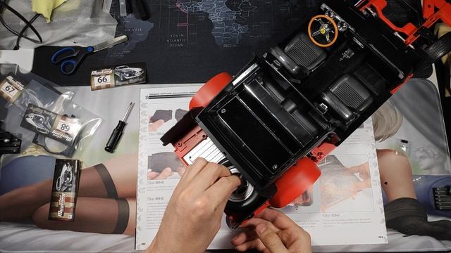 Устанавливаю на шасси панели багажника и запасное колесо с домкратом. Начал собирать радиатор.