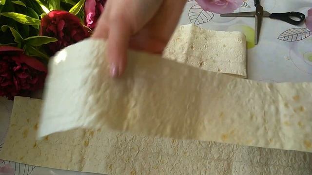 лаваш нарезаю полосками и складываю треугольник.