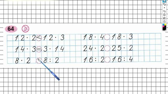 Выполняя задание 64 на странице 64 вам нужно уметь сравнивать числовые выражения ставить знаки а также выполнять умножение и деление двузначных чисел на однозначные числа.