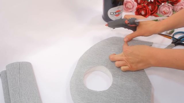 Всем привет! В этом мастер классе я покажу один из вариантов оформления бутылки шампанского на подставке украшенной цветами из гофрированной бумаги с конфетами внутри.