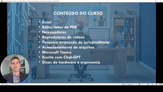 Curso de Informática Aplicada à Atividade Judicial Hotmart : bit.lyinformaticaaplicada2024 RESUMO DO CONTEÚDO: 1 Windows Configurações Atalhos Extrator de texto Gerenciamento de janelas Windows Explorer Travamento do sistema Recuperação de arquivos 2 Microsoft Word Configurações Autocorreção e autotexto Atalhos Criação de atalhos Navegação no texto Localizarsubstituir Estilos de formatação Formatação em sistemas de processos judicais Macros Partes rápidas e mala direta 3 Excel 4 Editorleitor de PDF 5 Navegadores 6 Reprodutores de vídeos 7 Pesquisa avançada de jurisprudência 8 Armazenamento de arquivos 9 Microsoft Teams 10 Escrita com Chat-GPT 11 Dicas de hardware e ergonomia Carga horária total de aproximadamente 12 horas.