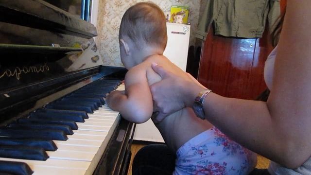 Девочка двух лет впервые играет на пианино.